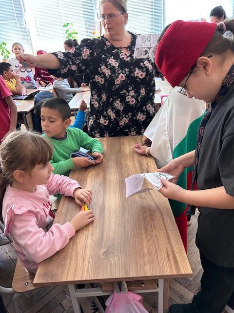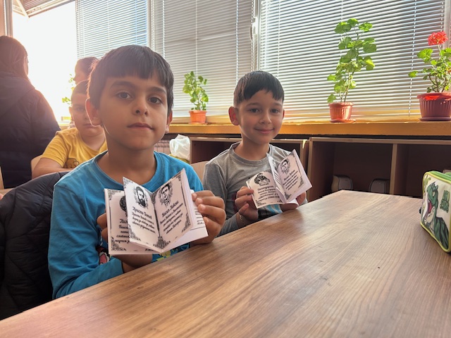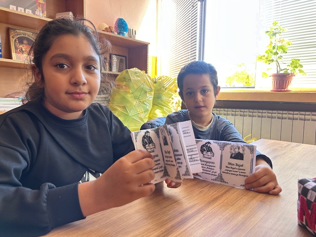 Нашите четвъртокласници с много ентусиазъм и старание представиха своя урок по родолюбие пред малчуганите от 1.б клас, които слушаха с интерес и възхищение. 💫 В края на срещата, с помощта на по-големите си приятели, първокласниците изработиха мини книжки, посветени на народните будители — символ на знанието и вдъхновението, което те ни завещават. ✂️📚
